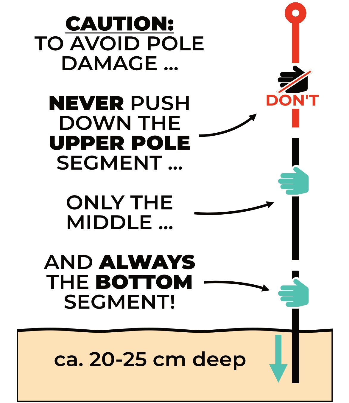 ❷ Push the first pole on the front/wind side approximately 25 cm (half a pole segment) into the sand, using your body weight from above, as shown on the left. Keep hands and the pole dry and greaseless for a good grip. Then clip in the hook.