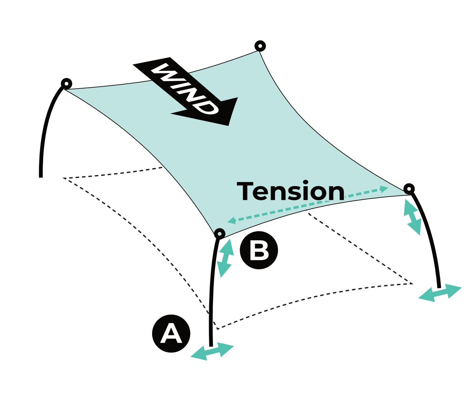 🅐 The further apart you place the poles on side away from the wind, the less the sun sail flutters in the wind, but the more it bulges.