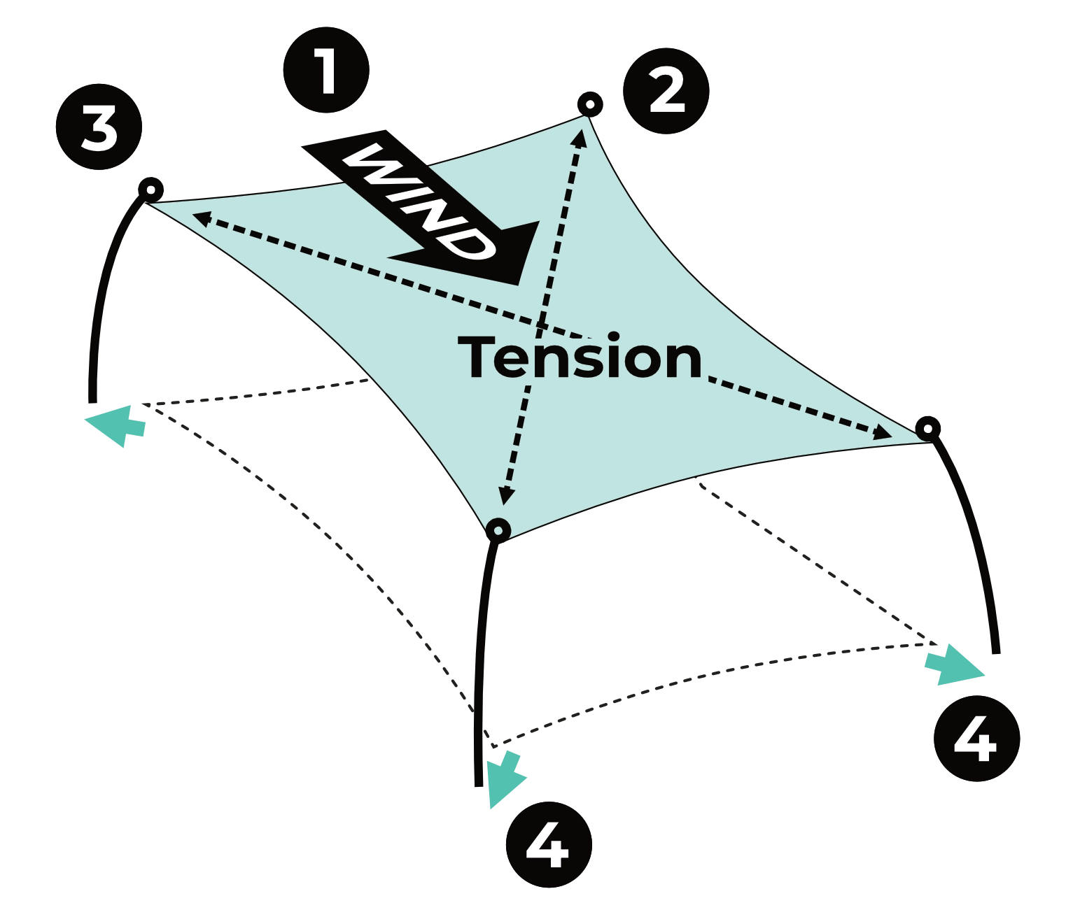 Usually, wind blows horizontally/flat. But around obstacles, such as buildings or steep hills, wind can sometimes blow down from above right onto FEATHERSHADE, which pushes the sun sail down. This happens rarely, but in those cases, the best is to move either closer to the obstacle, to get in its wind shadow, or to move further away or to the side, to avoid the turbulences altogether.