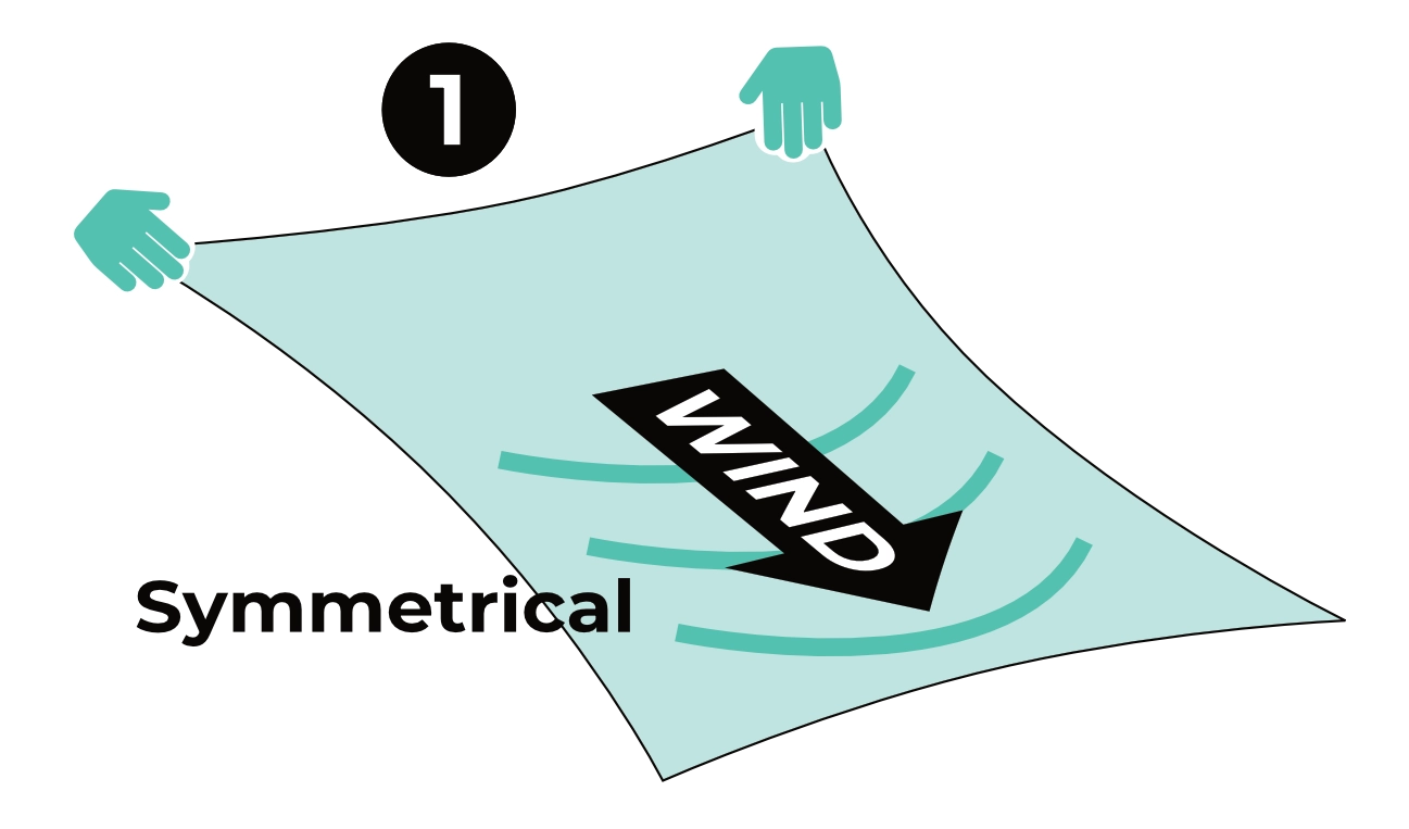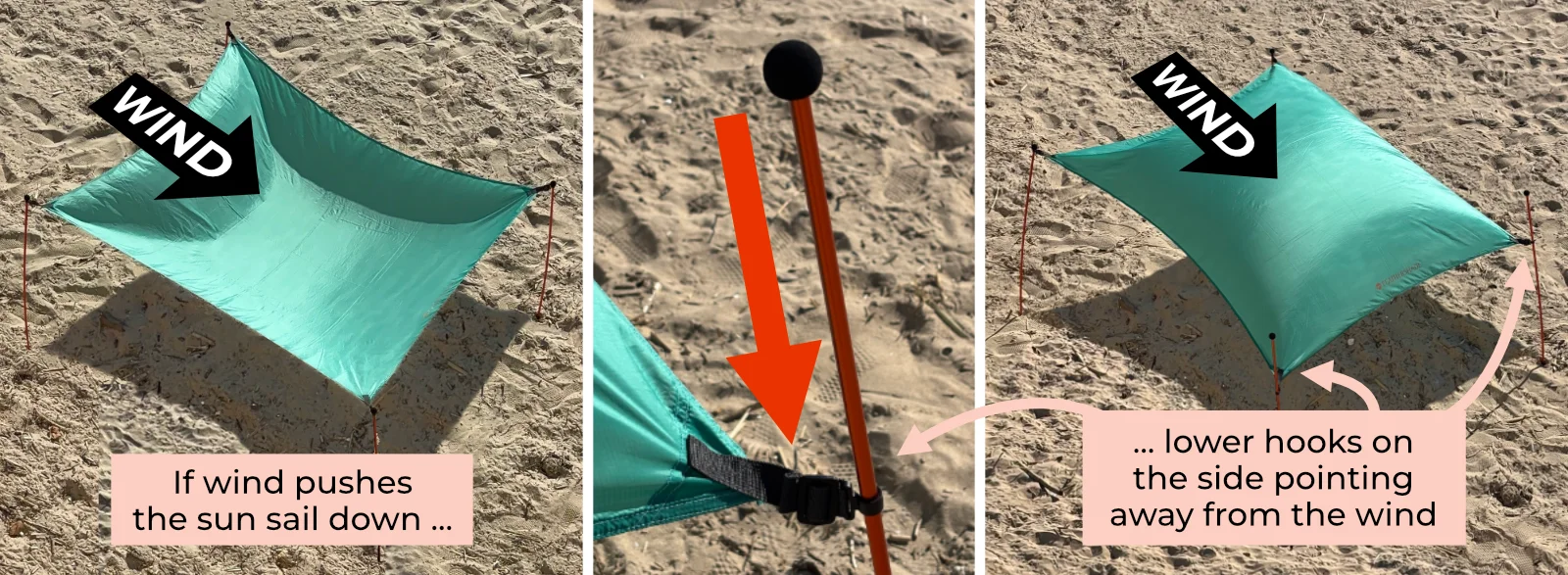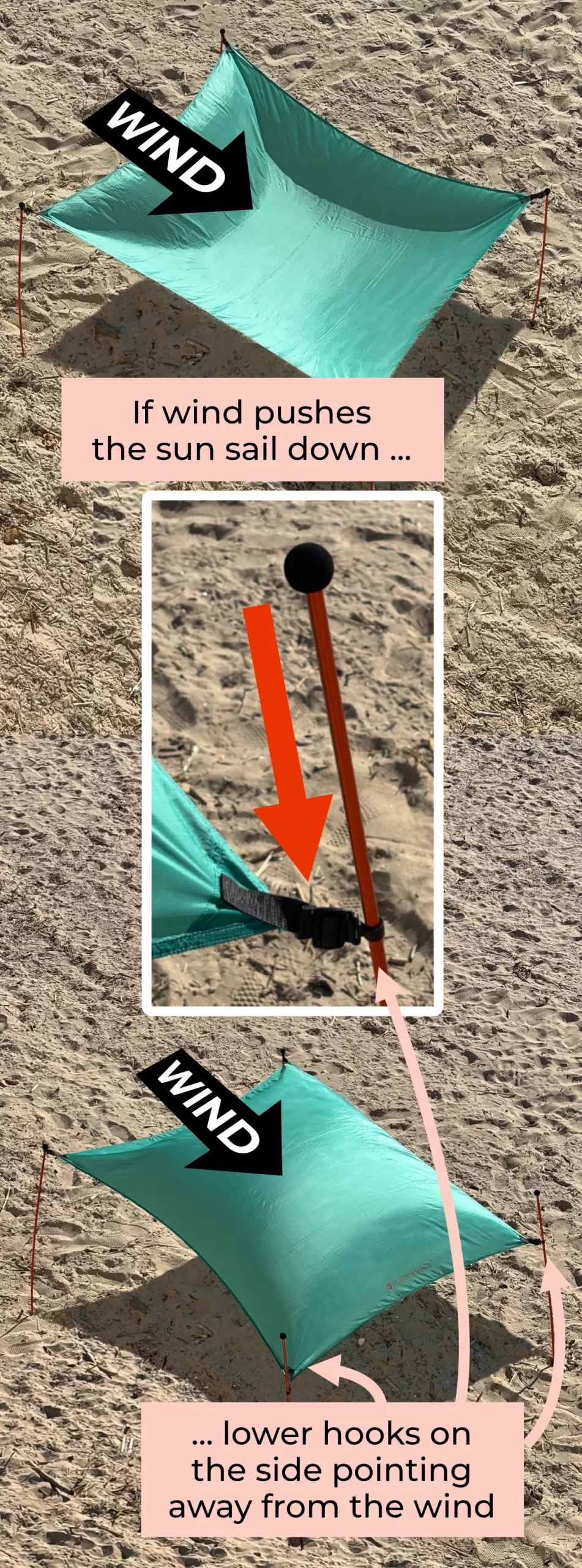 🅑 If the sun sail bulges downward (reducing the headspace underneath), lower the sun sail hooks on the side away from the wind so more wind pushed it up.