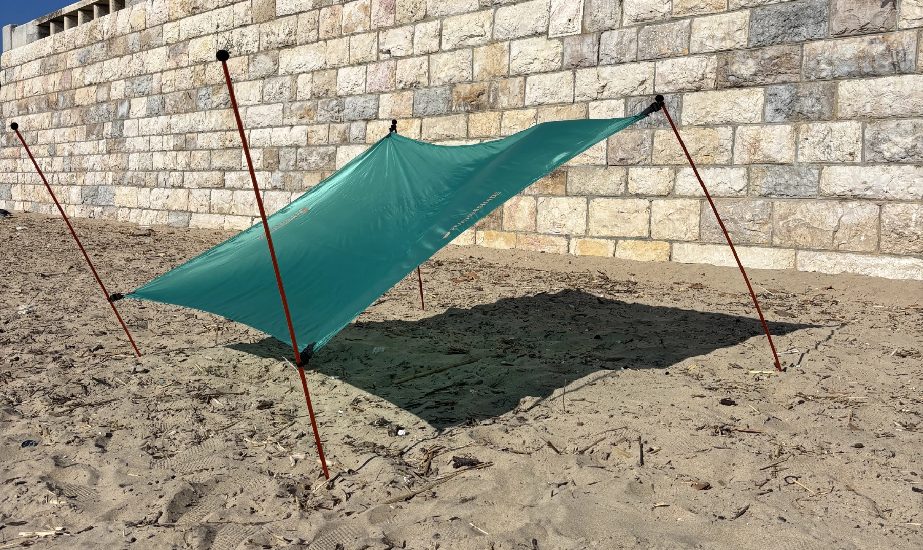 Always set it up starting with the poles on the fron/wind side. When taking down FEATHERSHADE, start disassembling with the poles on the other end.